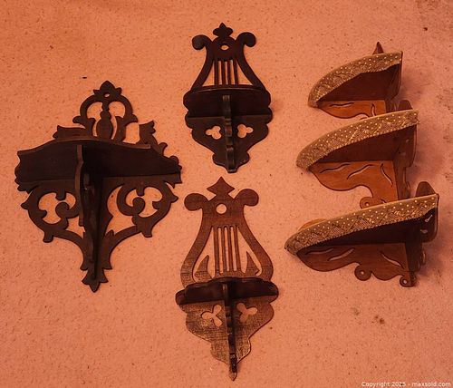 5 antique wood scrollwork shelves