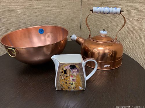 Copper bowl & kettle, creamer