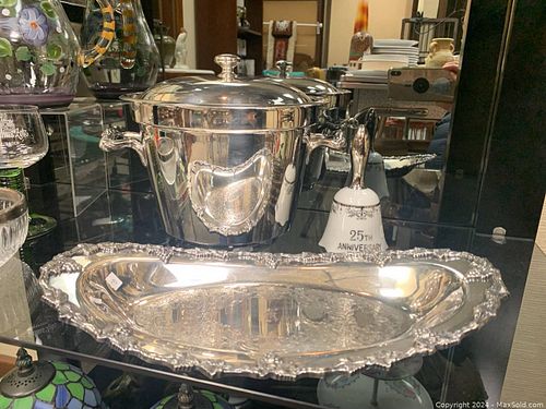 Silver plate wine cooler, plate & bell