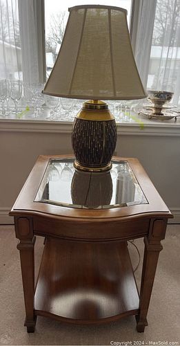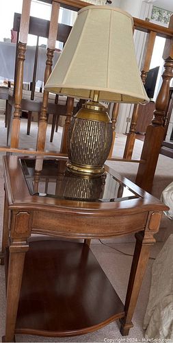 Wood & Glass Side Table + Brass Lamp