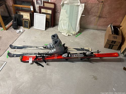 Downhill Skis, Boots, and Poles. B