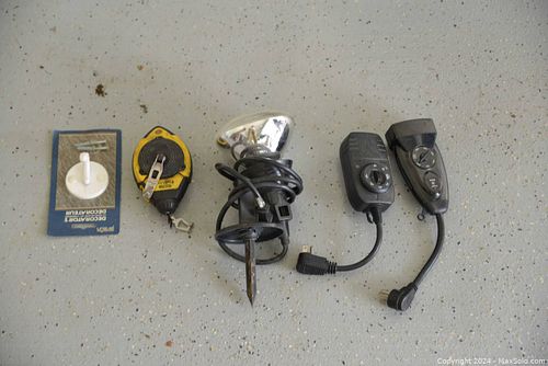 HANGING WORK LAMP, LEVEL & ASSORTED TOOLS