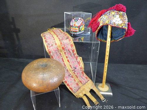Peruvian Andean Lot: Carved Bowl, Embroidered Hat, Woven Strap