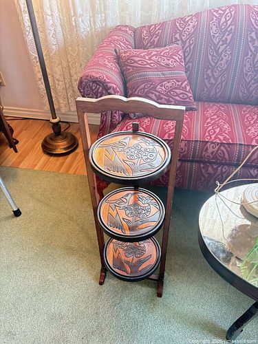 VTG. Three-Tier Carved Wooden Stand with 3 Removable Trays