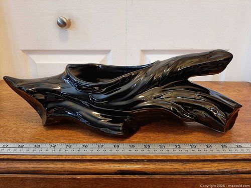 Black glossy kitsch glazed ceramic driftwood-style low planter or vase