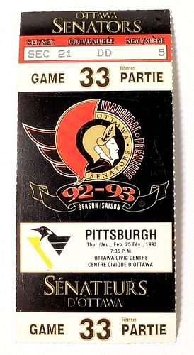 1993 OTTAWA SENATORS VS PITTSBURGH PENGUINS GAME TICKET