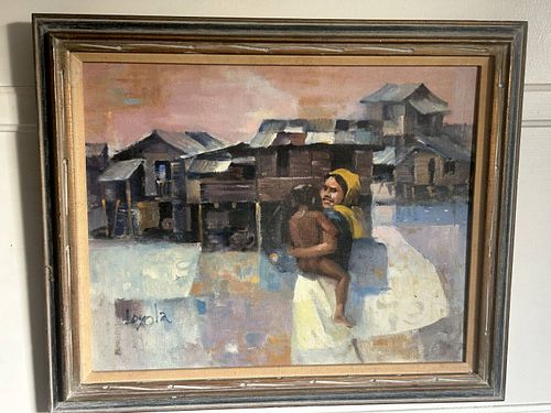 Mid 20th C. Oil Painting by Victor C. Loyola — Mother & Child Village Scene