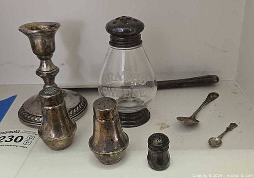 Sterling Salt Pepper Shakers, Spoons, Candlestick Holder, More