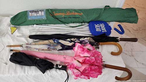 Lot of 4 Umbrellas, 1 beach umbrella and 1 Folding Sport Seat