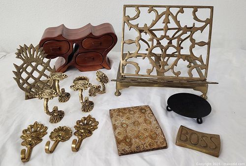 Mixed Lot: Brass Decorative Hardware & Small Wooden Chest