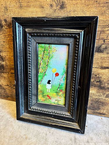 Vintage Signed Louis Cardin Girl with Balloons Enamel on Copper Painting