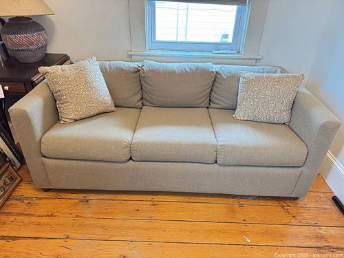 Beige 3-Seat Woven Fabric Sofa with 2 Throw Pillows