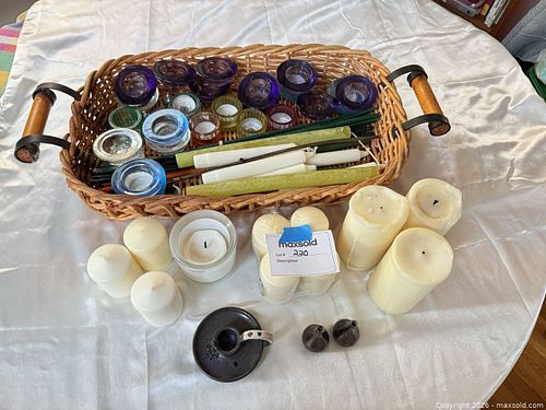 Lot of Candles, Votive Holders, Metal Chamberstick & Wicker